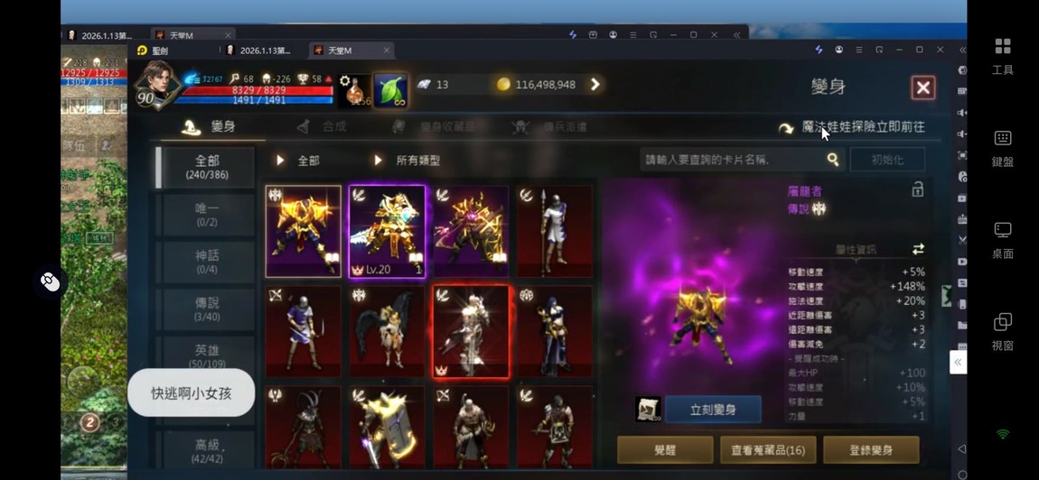 【神聖劍士、90等、可移民】90級聖劍金技4紫技紅技滿七彩爆擊阿頓覺醒+獨角獸覺醒+兩紫聖物名譽幣近800萬