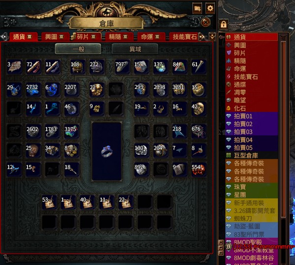 倉庫頁:通貨+輿圖+碎片+精隨+命運+技能寶石+通牒+凋零+瞻望+化石+高級倉庫*25+巨型倉庫*1