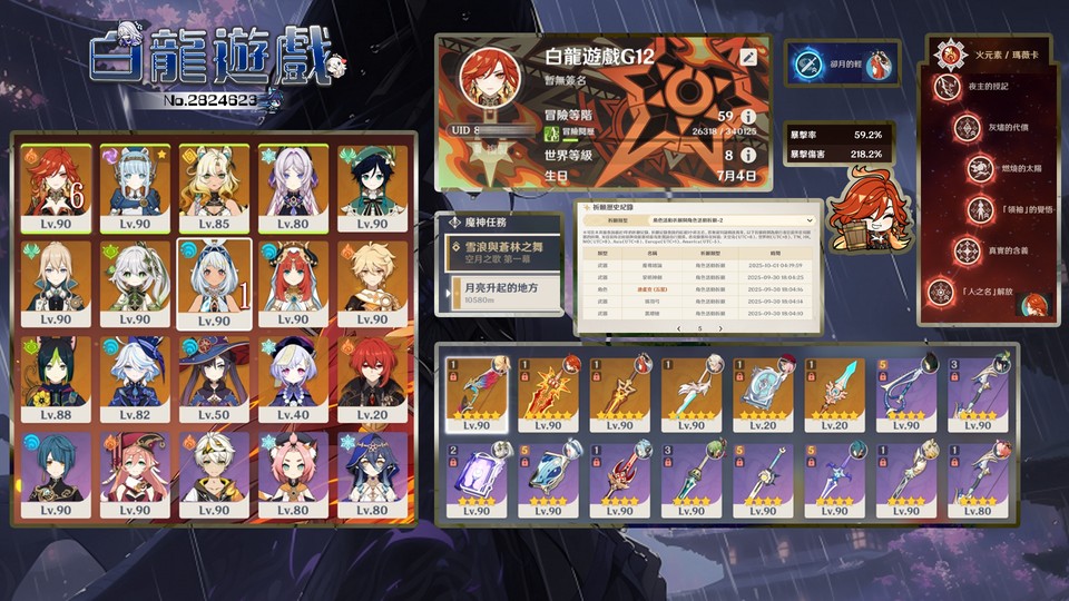 【男、59等、25金角、6金武】G12_火神6+1妮露1+1瑪拉妮1+0伊涅芙茜特菈莉希諾寧水神草神_角色池大保