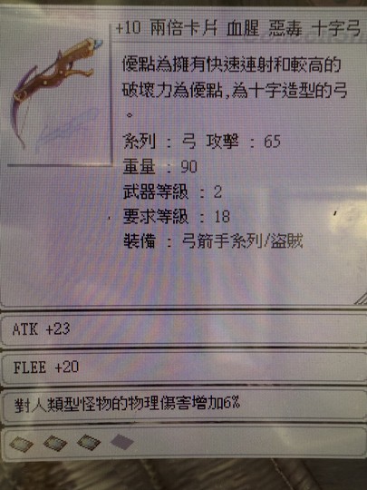 +10十字弓ATK23 FLEE20 人類6%物傷 2海葵1赤蒼蠅