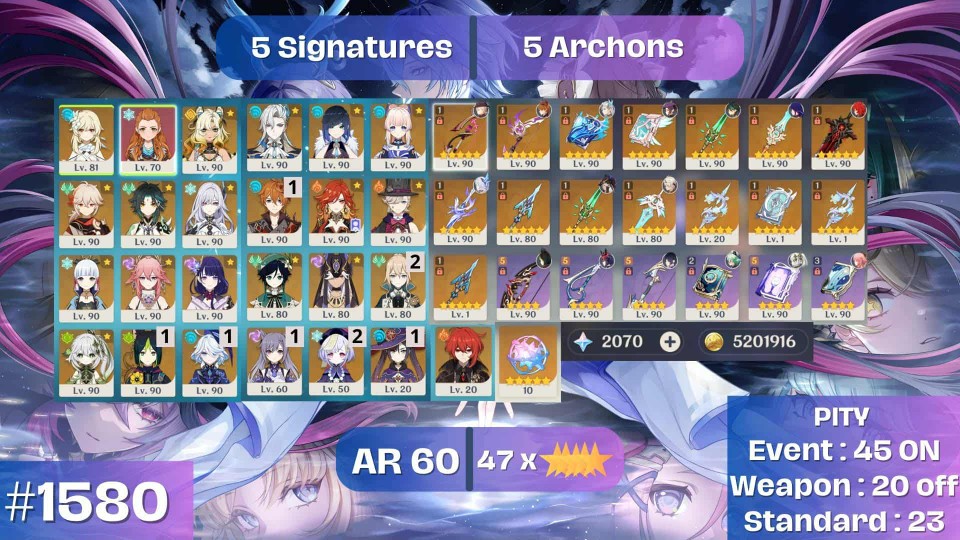 【女、60等、32金角、15金武】⭐絲柯克+水龍+1命公子+林尼皆專武_萬葉_5神_心海_夜蘭_希諾寧_綾華_八重
