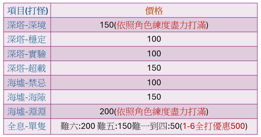 !需打怪活動或固有的角色需要一定練度才能打滿