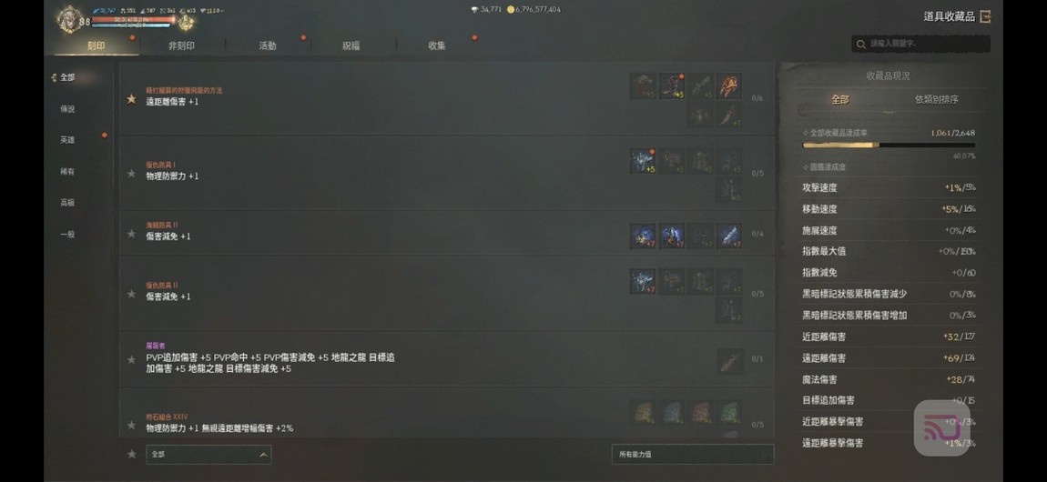 【總收藏】:40.07% (遠傷命69/90、DEX23、物防+116)