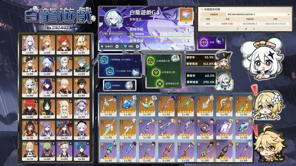 【女、60等、33金角、10金武】G4_水龍1+1草神3+1水神2+0希諾寧0+1絲柯克愛可菲火神海森127抽大保
