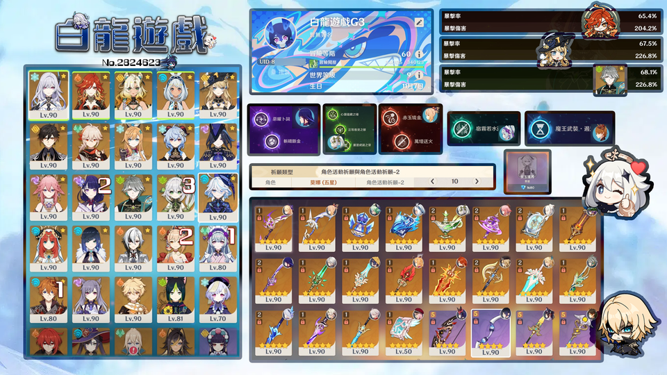 【男、60等、36金角、27金武】G3_火神0+1草神3+2雷神2+2海森0+1妮露絲柯克愛可菲希諾寧克洛僕人夜蘭