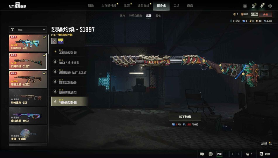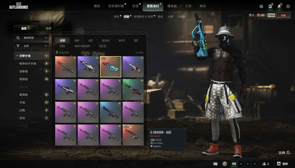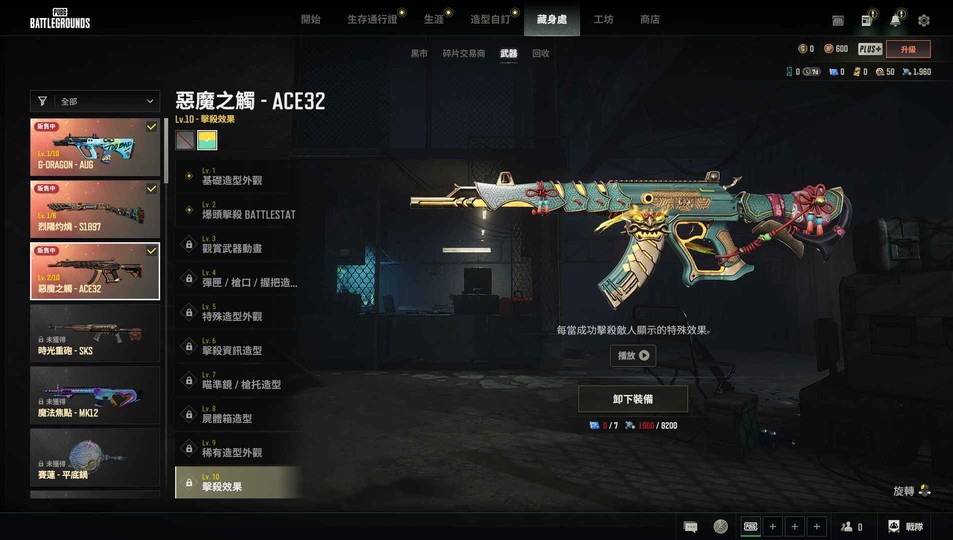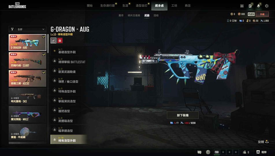 權志龍aug+2級惡魔ace+惡魔ace異色+烈陽s1897+紫色煙槍m79 老黑黑鬼套裝 極限追逐者套裝 位元組意志套裝 漁夫帽 工坊很多裝備