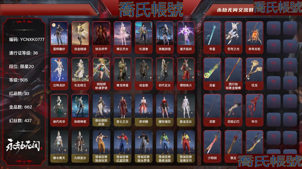 33紅662金丨等級505丨隕星2丨金磚190丨幻絲437丨通行證已升級Lv