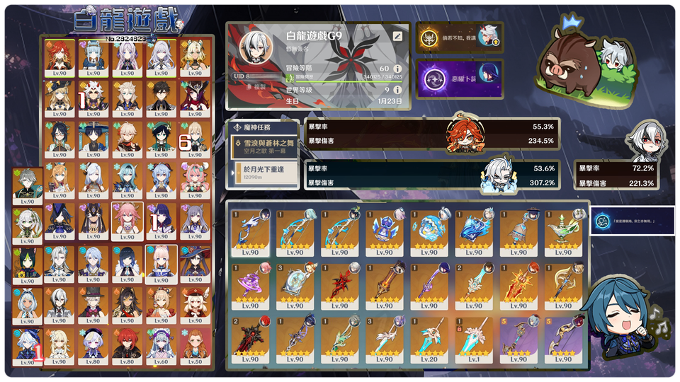 【女、60等、53金角、28金武】G9_火神0+1那維0+1茜特0+1瓦雷莎伊涅芙絲柯克愛可菲希諾寧恰斯卡閒雲心海