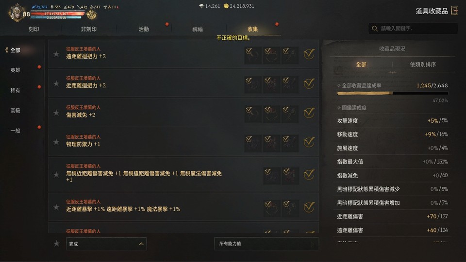 【總收藏】: 47.08% (近傷+70、近命+79、物防+121、力量24)