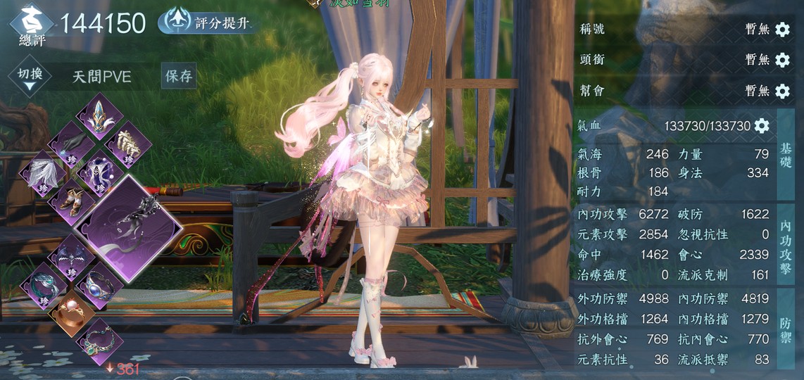 出 素問(半雙修進度號) 7級結義 288鶴舞(武器).月亮(祥瑞).霽雪(赤狐白頭).熙明(太陽神頭).驚焰(聯動貓貓頭).旋悠光(雙馬尾轉盤頭).重蝶化夢(長歌絕技皮膚).自染皓雪(金髮) - 商城288時裝:溫語.空冥.開陽.紫微.玄喵.泳衣.衣香.白龍.哪吒.朱雀.金禱.玉澤.赤狐.林澤.皓雪.白狐 - 滿國色:霜降.秋分.小雪 立冬3/4 餘1130國色 (總31130) - 絕技 滿:長歌.萬劍.本絕.太極.九天 登峰:鈞天 化境:狂發.繁花 - 群俠 滿:笛子.師師 絕塵:藥罐.飛花 登峰:龍馳 化境:小包.輝雪.槍鋒.不動 - 打造 武器 金:霽日.疾刃.朔捲.殘心.天火 紫:澄冰 護腕 金:秉威.萬刃.淨心.平江 紫:干戈 腰帶 金:豎壁.九霄 紫:柔坤 衣服 金:平江.雲起.風動.固若.淨心.赤鋒 鞋子 金:震海.柔坤 紅:壁立 項鍊 金:怒劍.執我.彩犀.驚羽.飛絮 - 內功:靈韻:定鋒/雙破防一耐力四土一火日月 pvp 火土.水土 pve 金水.金木 - 強化兩件已完美 鑲嵌除了雙手鐲三個紅玉其他全六 - 轉性丹x2 轉職丹x1