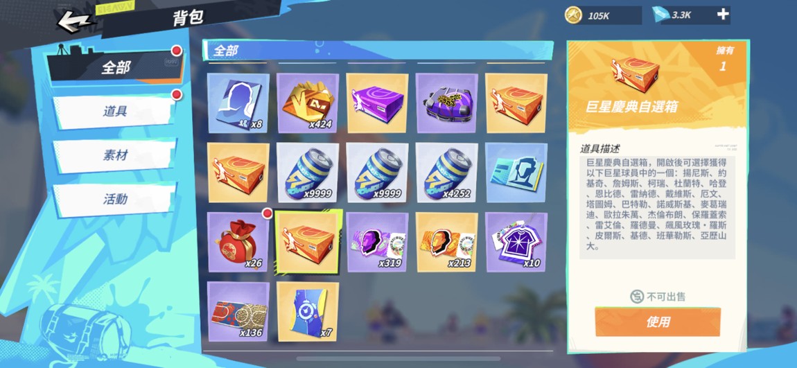 派對新秀*1,巨星球員自選箱*3(未開)、回歸時裝自選箱*1