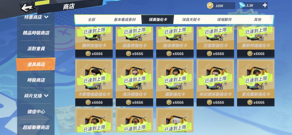 巨星登場:213張(保底兩次)、大頭卡424張,可以點21技能、這週還未買、球員碎片27600+冷卻卡共有48600(可換4隻突破角)