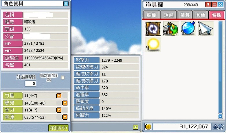 裝備:雷之標、58攻7克利思拳套、10攻2敏4幸德古拉紅手套、11敏2幸褐扣帶鞋、12敏海王帽、3敏15幸黑骷髏服、10敏3幸紅骷髏皮裙、8幸破舊披風、7幸梅花耳環、眼鏡、電吉他項鍊