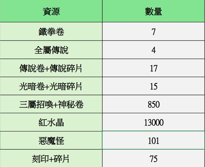 1萬1多紅寶石+86隻的惡魔怪,還有精鍛石79顆,讓您自行運用。