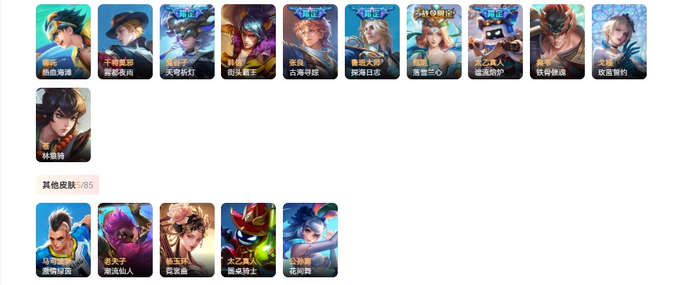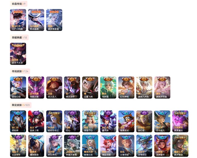 【限定皮肤37】 阿轲化蝶舞 赵怀真器灵浮梦炉 虞姬愿照岁时盈 嫦娥器灵落星盏 澜愿照九州拓 太乙真人谧流熔炉 鲁班七号江户川柯南 马可波罗怪盗基德 老夫子百相守梦 百里守约百相守梦 东皇太一噬灭天穹 桑启鸣野蒿 李白谪仙醉月 姜子牙天穹之誓 周瑜熔金海岸 刘邦剑破天穹 鲁班七号蔬乡物语 狄仁杰魔术师 李元芳蔬乡物语 沈梦溪龙舞盛年 鬼谷子天穹祈灯 云中君纤云弄巧 张良古海寻踪 鲁班大师探海日志 裴擒虎擒涛扼浪 狄仁杰阴阳师 桑启海盐诗旅 元歌无心 上官婉儿神器万象笔 干将莫邪真爱魔法 赵云皇家上将 甄姬落雪兰心 钟无艳超时空战士 孙悟空孙行者 鬼谷子五谷丰年 项羽海滩派对 李元芳云中旅人