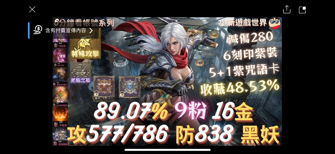 【天堂W】【粉色專區】:89.14%、9粉、16金、【最高攻命577/786】【防838、減傷280、抗暈233%】、1金滿紫技、水/風眼滿分、2紫加護、5+1紫咒語卡、6刻印紫裝、收藏48.53%、漆黑死騎父子、黑妖 EP.680以下數值隨活動變動 【素質】:血量60,016、攻/命541/762、防/魔防838/554、減傷/PVP減傷280/93、暈命/抗暈111/233% 【素質】:血量60,053、攻/命577/786、防/魔防786/544、減傷/PVP減傷264/93、暈命/抗暈102/233% 【粉變】: 3+3【法利昂/烏爾坎MAX/巴拉卡斯】(合成6/20) 【變身】: 6+1金、20+2紫 【變身收藏】: 收集卡片(88.10%)、完成收藏品 (64.80%) 【變身外觀】:11紫 (漆黑死騎) 【粉娃】: 3【菈特/底比斯/不死鳥MAX】(合成3/20) 【娃娃】: 8金、20紫 【娃娃收藏】: 收集卡片(88.10%)、完成收藏品(70.60%) 【娃娃外觀】: 5紫 (漆黑死騎) 【技能】:1金、滿紫、滿紅 【淺力】: 如影片 【咒語卡片】:5+1紫、如影片 (收藏81.25%) 【提煉術】:加速5階、勇水5階、料理5階、魔力5階、龍珠5階、濃湯5階、戰鬥捲5階 【萬能藥水】: 萬能藥30滿,輕量1642/3186 【奉獻石】: 神秘、根源素質如影片 【護身符】: 亞丁世界(20階)、扭曲不幸(18階)、恐懼死亡(18階)、地獄不死(18階)、殘酷黑暗(18階)、不滅傲慢(20階)、死神(7階)、象牙塔(20階)、夢幻樂團(18階)、活動團結(61階) 【魔眼】:水/風24滿分 【總收藏】: 48.53% (近傷命88/106、STR31、物防+149) 【血盟樹】:勇猛3階、守護3階、智慧3階 ※裝備可能因實際交易狀況有所變動,以交易當下確認為主 【刻印紫裝】:+8祝粉碎鋼爪、+5祝死騎頭/靴、+3祝影子臂甲、+3祝監視者戒*2 【可交易紫裝】:+5祝牛人盔甲、+5祝卡爾斗、+5祝死亡手、+5祝權能褲、+3祝閃耀帕格立歐項鍊、+2祝卡爾皮帶、+2祝信念耳 【刻印紅裝】:鬥士項鍊、+3祝裂痕耳 【可交易紅裝】: 【商城裝備】:+8祝燦爛鬥士T、+9祝燦爛力肩甲、+6奧拉面 【徽章】:+10徽章-勇猛(紫)、+10徽章-守護(紫)、+10徽章-智慧(紫) 【標幟】:+8大將軍的標幟(紫)、+6奴隸標幟(紫)、+3龍的標幟(紫) 【符石】:+3祝忍耐符石、+4祝燦爛的力量符石 【紫加護】:火龍、風龍 【紅加護】:水龍、席琳(3)、巨蟻(5)、冰女(5)、歐琳(6)、活動氣息(7) 【藍加護】:地龍、未知的魔石(13) 【綠加護】:不滅(0)、水晶(2) 【備註】:救護證書369張(可能增減) 【傲慢之塔移動符】:9/10移動符 【寵物】:杜賓狗Lv20、牧羊犬Lv20、小獵犬Lv17 【寵物城】:管理所Lv4、宿舍Lv2、訓練場Lv3、遊樂場Lv0、圍欄Lv4 【通行證等級】: VII 【伺服器】:A區 【帳號類型】:台灣區Google帳號(可改綁) 【可交易紅紫裝備】:7紫0紅裝 【空身開價】:58.8(誠可議)
