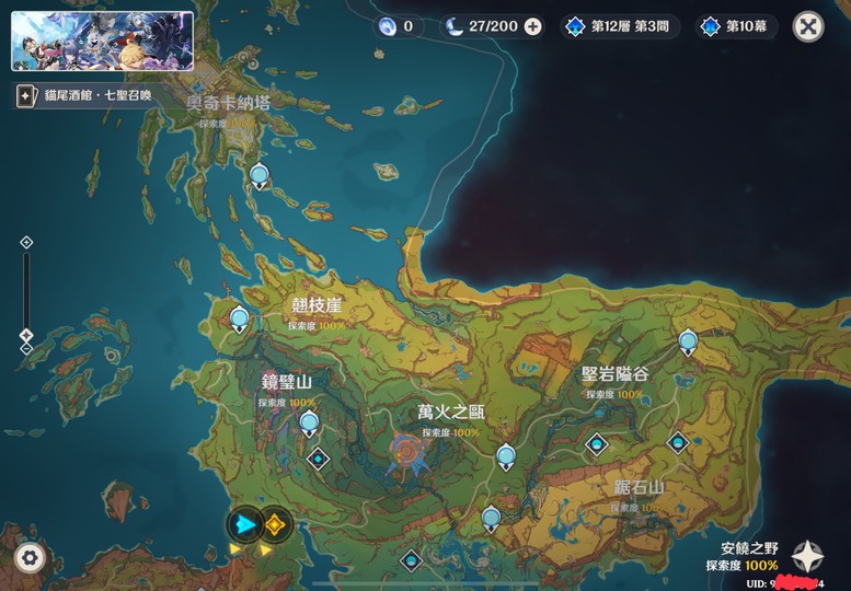 每日任務 大小活動 傳說任務 大世界地圖(包括探索度,神瞳等) 各種劇情任務(包括森林書) 新深淵(幻想真境劇詩) 舊深淵(深靖螺旋) 成就(包括挑戰者一二輯)