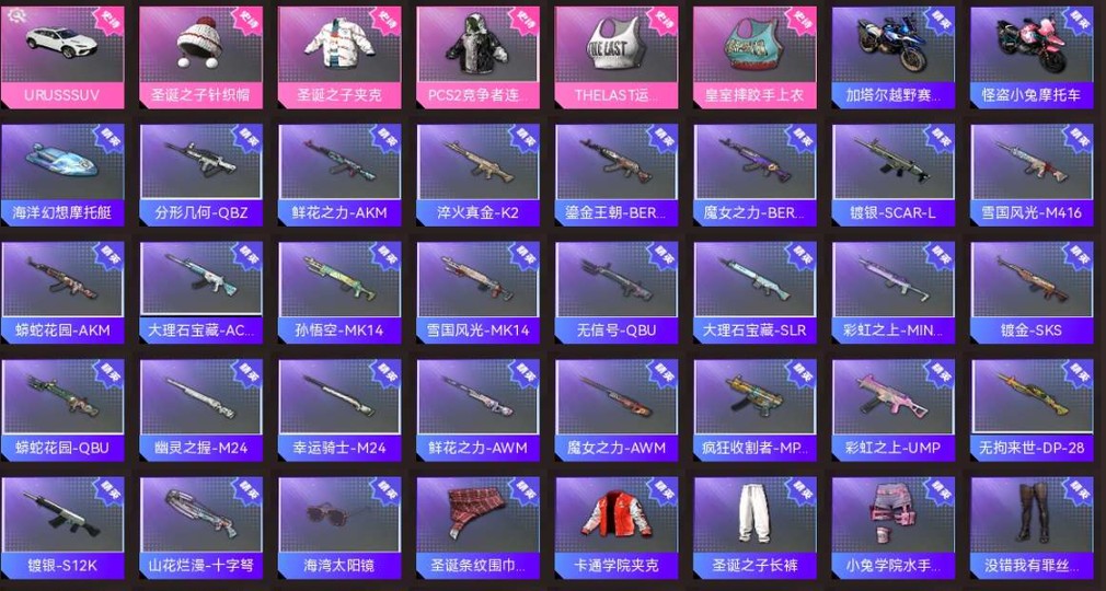 WCGS3 號 【絕版G-DRAGON-AUG2級,聖誕之子套裝,薩芬褲,女老黑,崩帶AK,魔力甜心二級包,悲喜,小紅鞋,卡通鞋,紫喵喵手,沙灘寶貝,自行車皮膚,頭發有幾個,工坊A幣90,1800蝸牛幣底子不錯的號,有初始郵箱,steam無消費記錄】 無排名, 生存等級37, 名譽等級2, 聚合物2100, 槍皮數量167, [成長型] G-DRAGON - AUG[2級]