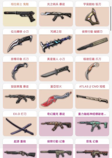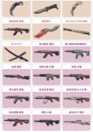 槍:獄燄業魔暴徒(流膿)、紫金暴徒、棄王暴徒、光哨暴徒、緋金暴徒、奇幻龐克暴徒、偵查幻象、惡鬼幻象、蛇年幻象、紫金幻象、鎏金警長、起源重砲、重力鈾能惡靈、相位衛士鬼魅...