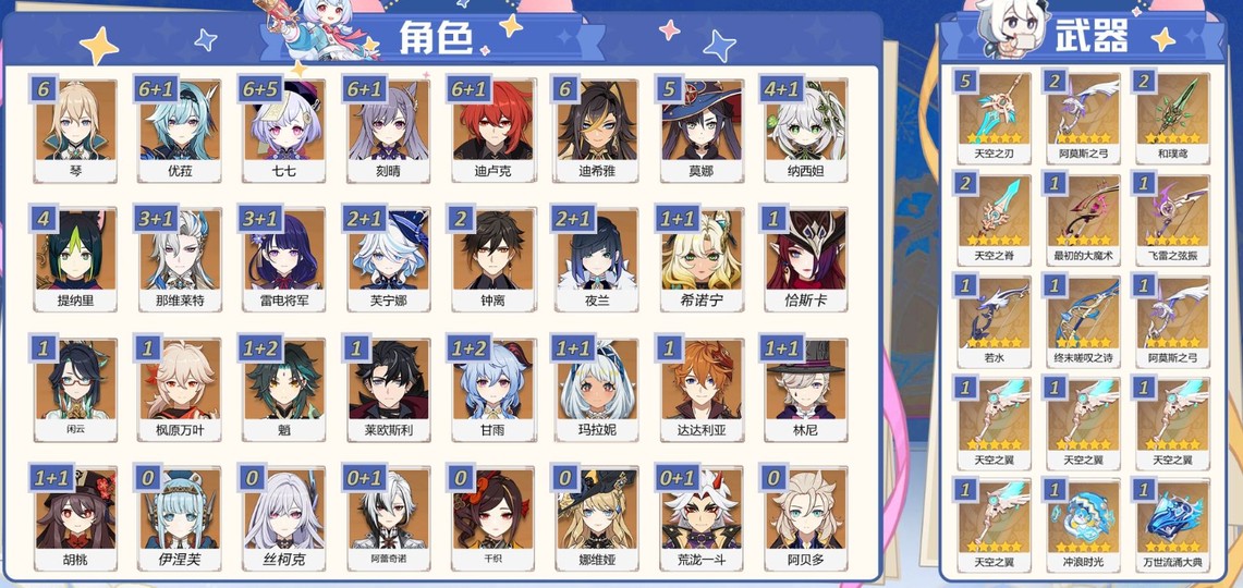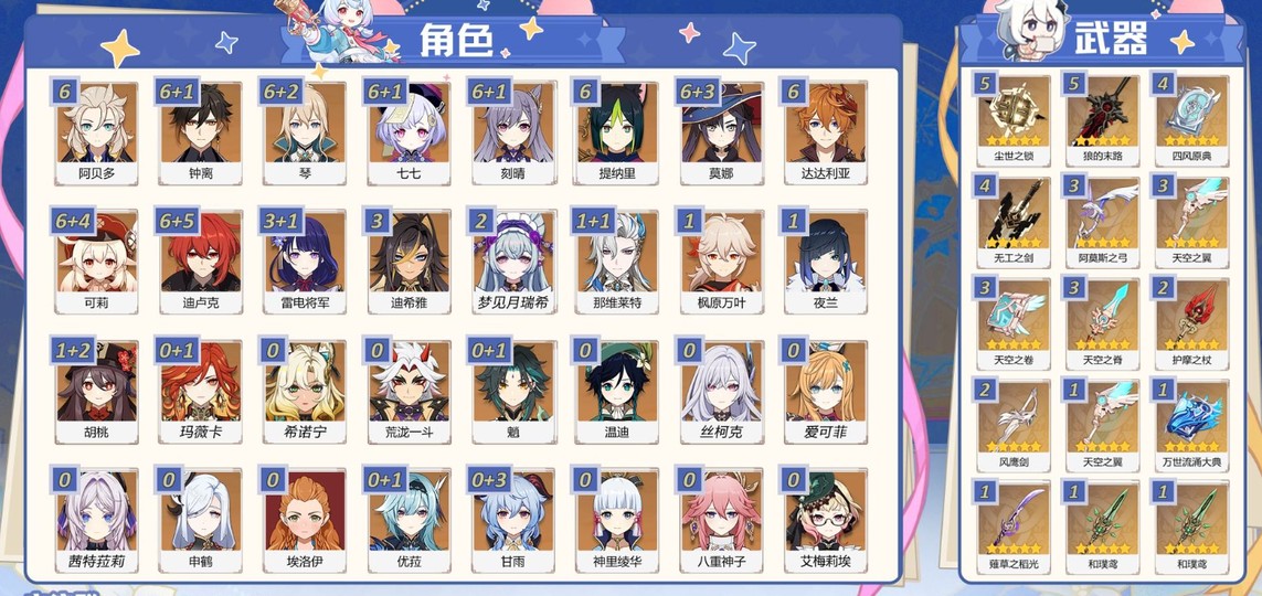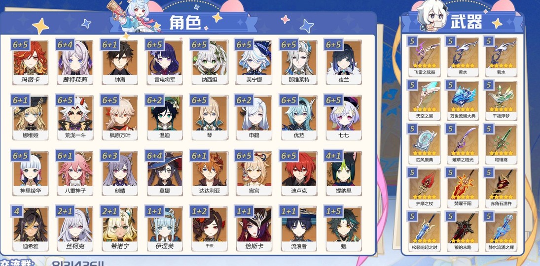 NH18 號【全圖鑒壹個不少,危境難度6每壹期都輕松打滿,金色幻化輕松拿下,滿命滿精三體人很多,新老深淵,大世界打什麽都像打核爆,無主的命星還有90個!資源全部溢出想拉什麽角色就拉什麽角色,資源管夠】 冒險等階 60,584黃,56個金...原神-官服-天空島服Ш頂級賬號【放心購 賣家已繳納保證金找回包賠