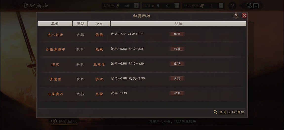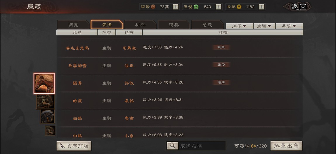| 武器 | 防具 | 馬 | 寶物 |