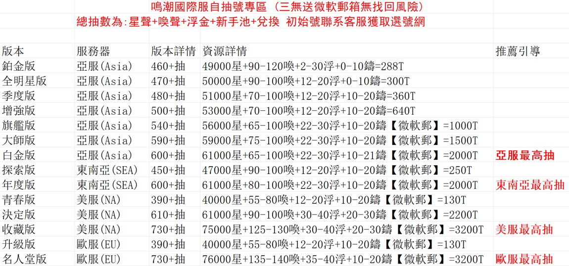 | 年度版 | 東南亞(SEA) | 600+抽 | 61000星+80-100喚+22-30浮+10-20鑄【微軟郵】=2000T | 東南亞最高抽 |