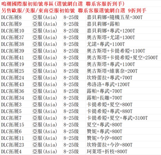 | DLC拓展11 | 亞服(Asia) | 8-25级 | 贊妮+今汐=800T |