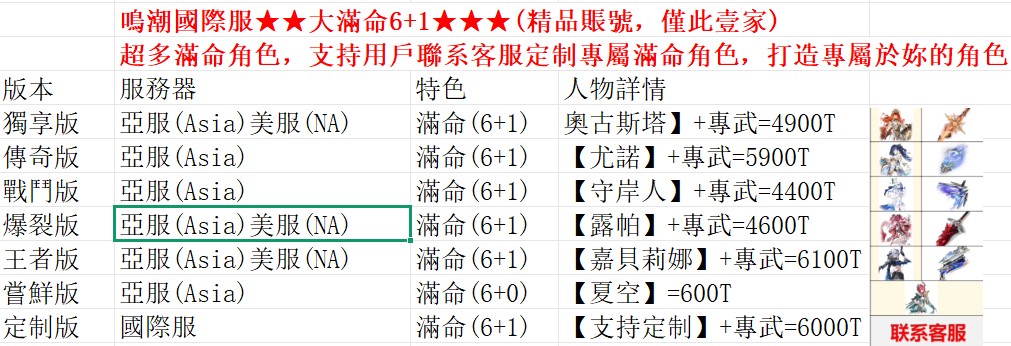 | 精英版 | 美服(NA) | 【三滿命61奧古斯塔+61卡提+61椿+01珂萊塔+01長離+01今汐】=43000T | 男主,80級 |