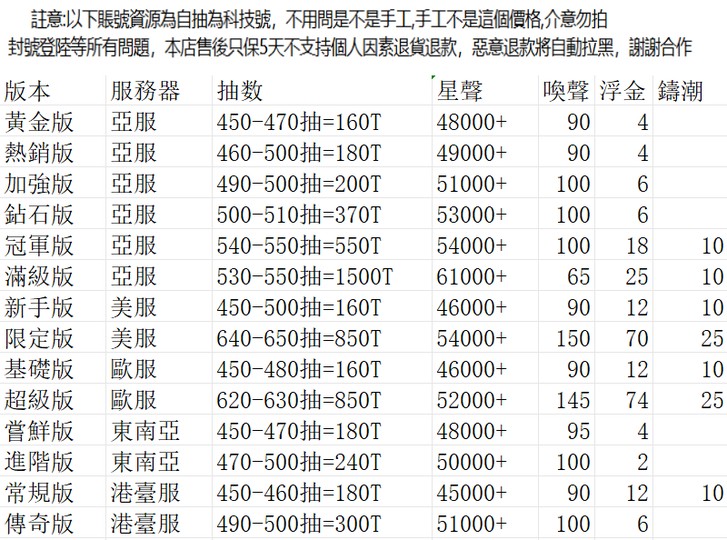 | 傳奇版 | 港臺服 | 490-500抽=300T | 51000+ | 100 | 6 | |||