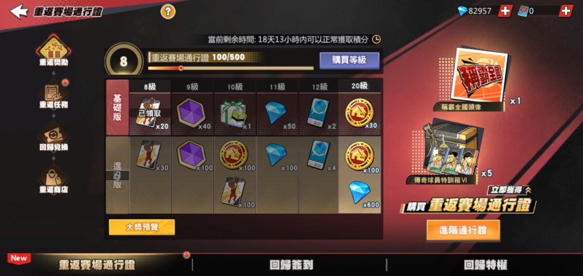 8萬5000鑽石 技能訓練卡2341 集訓技能卡1164 技能自選箱946個 技能自選箱100個 特訓卡碎片2685 回歸已啓動。7個8級淺能任選箱,牌位新人