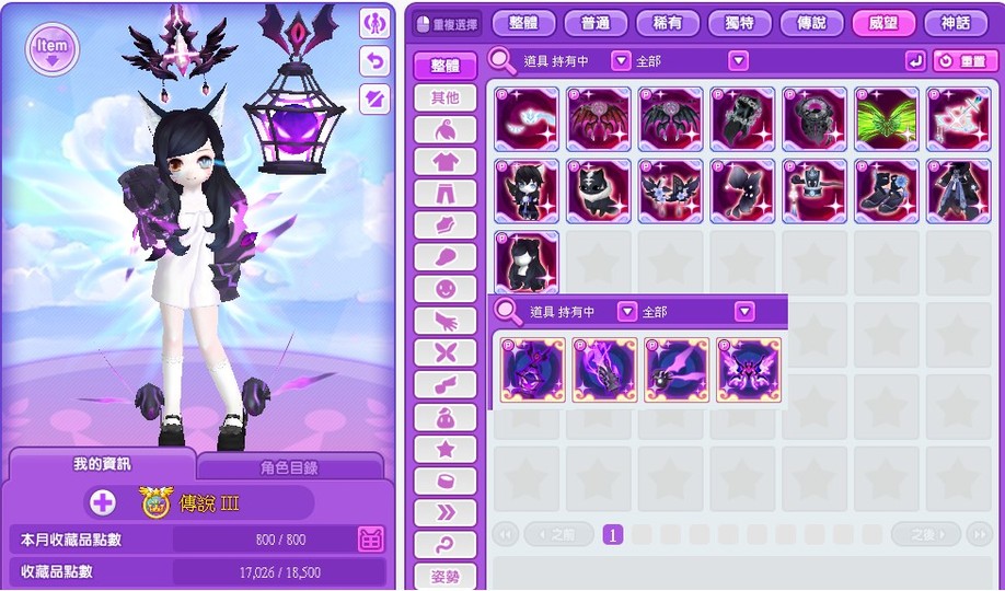 💯有傳說3收藏(17026)⬆ 如圖(只截大概裝),有4神話15威望裝備 (神話就是最頂的裝,沒有活動都要花很多錢搞),3張鑽石券,已換天藍狐尾 千年雪狐 璀璨鞋