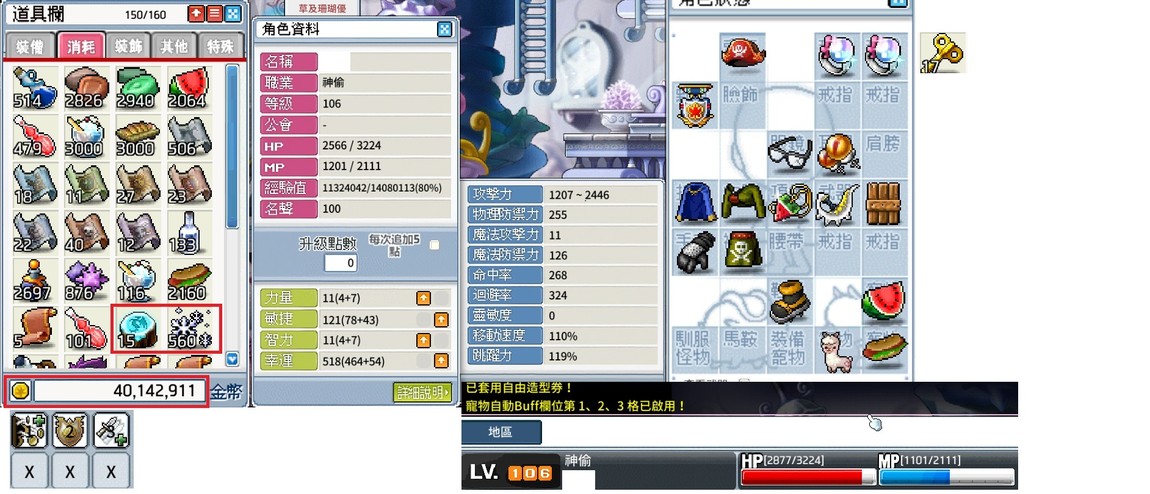 【106等、神偷_暗影神偷】工作忙沒時間玩,乾表2446,洗血水有拿滿,資料都可更改