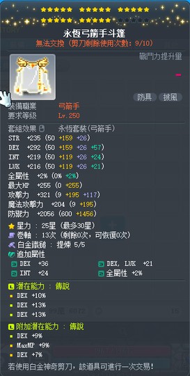 【永恆弓箭手斗篷】雙傳25星36%敏永恆弓箭手斗篷 附加97敏大雙 白5全b~