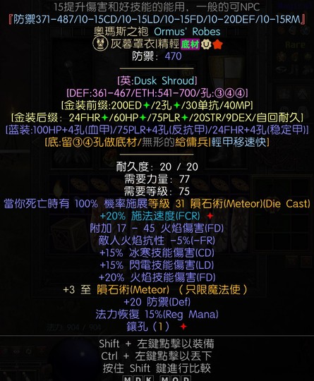 奧瑪斯之袍,15冰/15電/20火/20防/15法恢/3隕石術 (已鑲55死火)