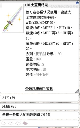 +10星亞爾特劍~頂ATK+39~近頂迴避+21~頂無視一般敵人的防禦力12%