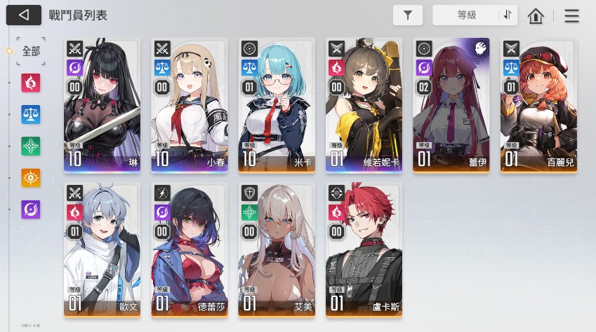 帳號等級10 進度1-6 小春0+0 琳0+0 維洛妮卡0+0