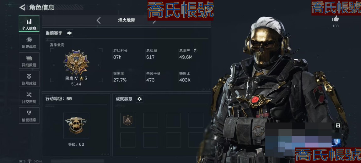 【11等】總資產:49M,哈夫幣:763W,武器皮膚:7,烽火60級:黑鷹_,基礎安全箱