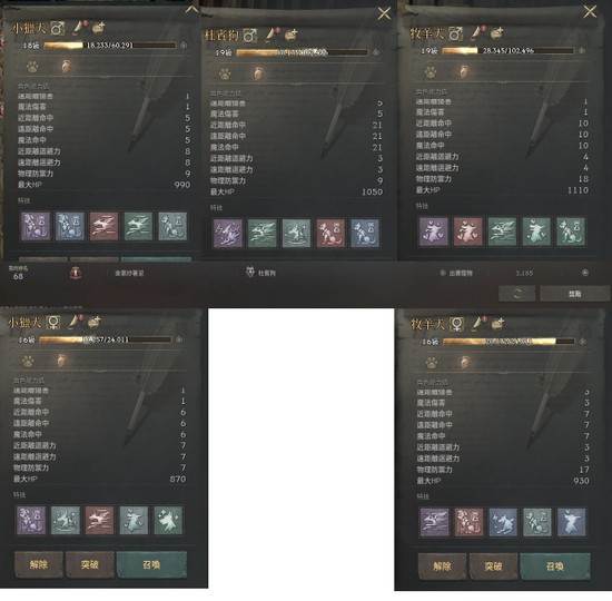 <素質1>:練功型攻命防(牧羊犬 白字&pve): 攻395(544) / 命604(695 都+被動技) / 防585(732) 近迴75 / 遠迴 125 / 魔迴52.hp:44,099