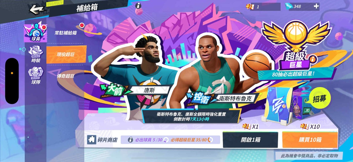 資源類:鑽*348、黑卡*2、巨星天賦卡*127、球員碎片*16500、巨星登場券*1、群星雲集券*26