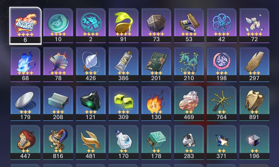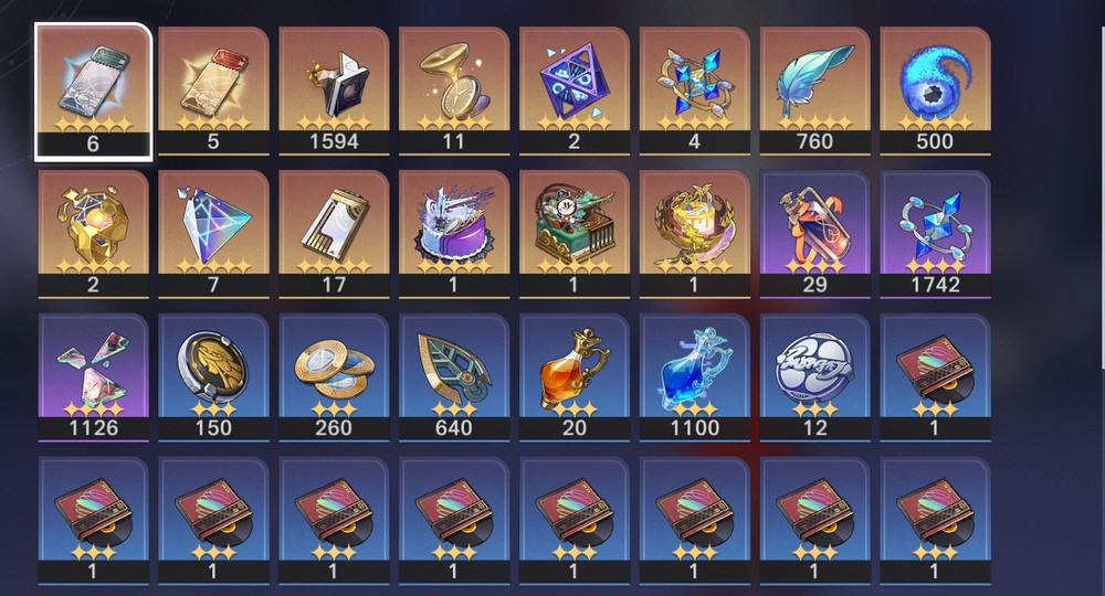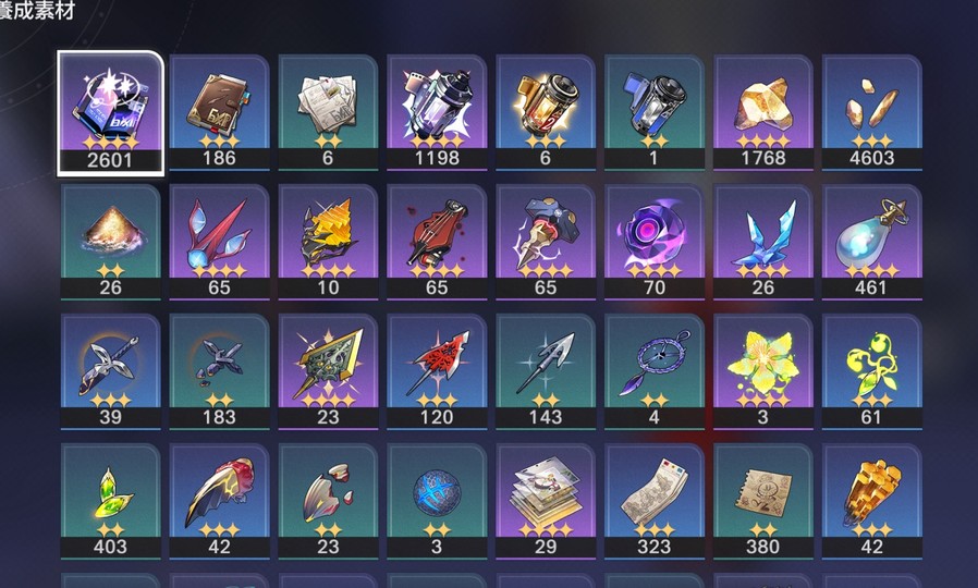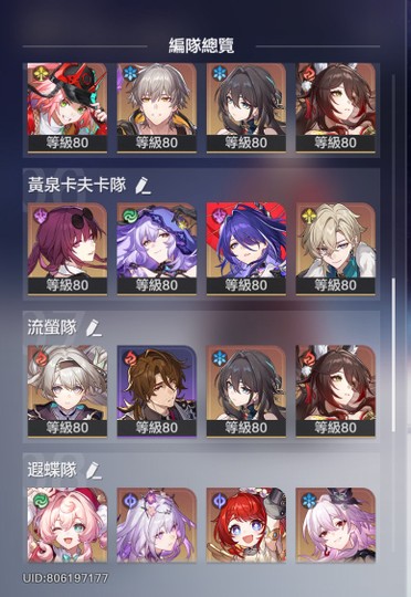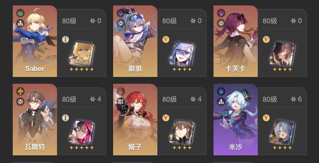 B.除了上面所提到的,這帳號也課了將近好幾萬台幣(我還真有細細數過),月票及小月卡通通每次皆買齊,偶爾會課金大月卡,並抽取強大的角色到2+1外,也抽將會用到的隊伍支援人物通通抽齊,所有的人物、星魂、光錐可參閱附上的圖片(另外儀器數值都機會接近中高階)