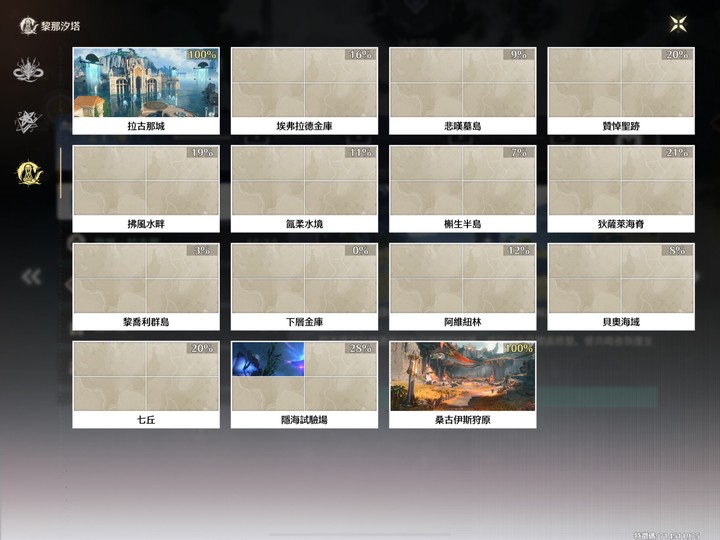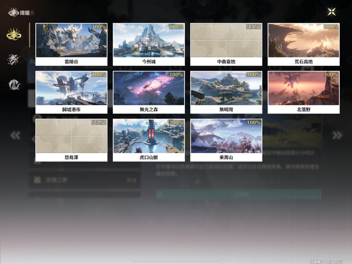 主線至第二章幕間,多支線任務未完成,地圖探索度及現有資源如圖所示