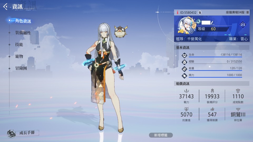 【60等】職業雲心 37000戰力 虛世之影+11 寵物46等 不清倉 可綁其他信箱
