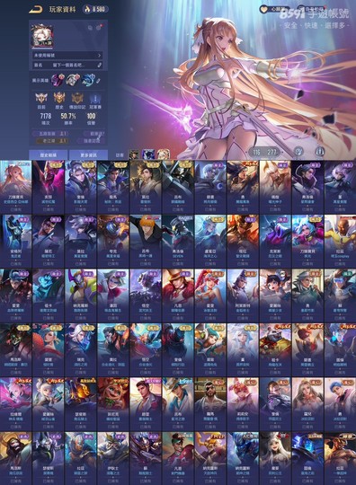 歷史璀璨傳說印記!近全英雄近三百造型!共116英雄277造型!勝率近51%!!共8次S戰場傳說印記!常用奧義已升滿!!