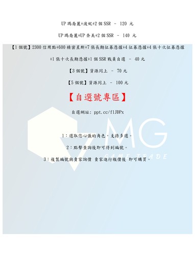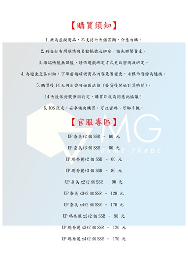 1.此為虚擬商品,不支持七天鑑賞期,介意勿購。 2.移交如有問題請勿更動帳號及綁定,請先聯繫賣家。 3.確認帳號無誤後,請依遊戲綁定方式更改密碼及綁定。 4.為避免交易糾紛,下單前請確認商品內容是否變更,未標示資源為隨機。 5.購買後14天內封號可保固退換 (發貨後開始計算時間), 14天後依封號原因判定,購買即視為同意此協議! 自選網址: ppt.cc/f1JDPx