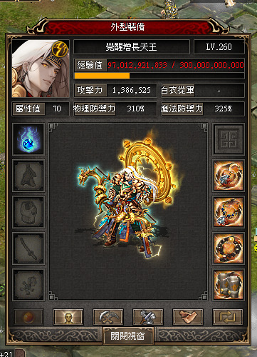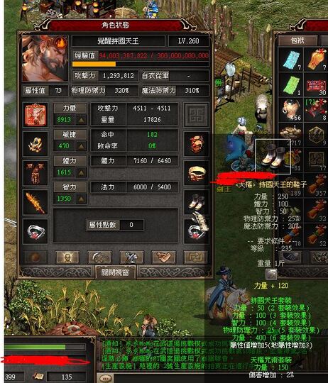 260完美覺龍天 (已開星宿) 100/300敏書 裝備:120龍天套戒 覺龍符 +15經驗覺龍武 100雷 +5雷套 +5盤古 雪氣