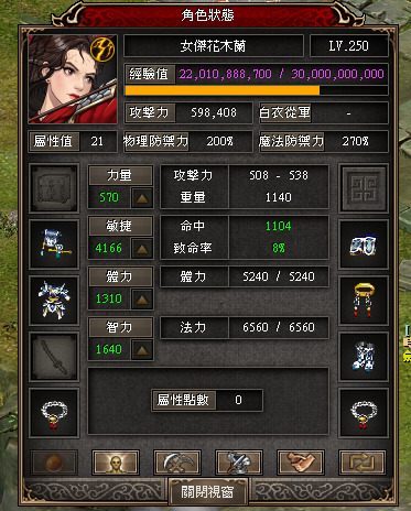 250花木蘭 1000點 (沒開星宿) 裝備:天照套戒