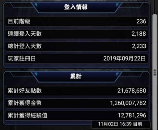 登入天數2188天以上,手機帳號,非模擬器、純手動登入當羈絆小號用。