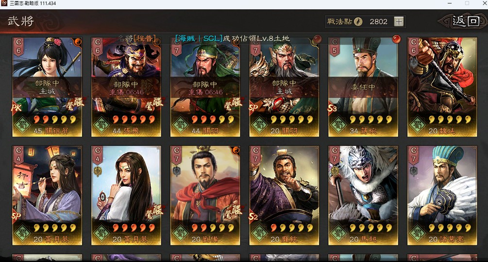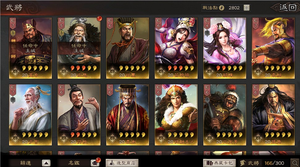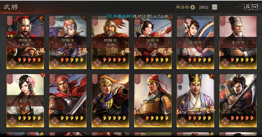 可求賢 農業100 周瑜和劉備有造型 賈許、郝昭和sp袁紹有動態 裝備:3好學 1武聖 1擐甲 1樂奏 靈動考工書 營造:1風水 1繁榮 1農藝 考工殘卷2 有一套主城外觀 挺好看的 掣刀可以換了(還沒換) 獨行赴鬥差劉表 新增士爭先赴