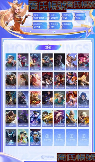 【OBWHFBB054542】 珍品傳說1 無雙2 典藏1 傳說26 史詩81 限定98 英雄126 皮膚257 稀有英雄9 貴族8級 總場次7885 皮膚價值:201456 【珍品傳說1】 宮本武藏黑崎一護 【無雙皮膚2】 李白碎月劍心 諸葛亮天機白澤 【榮耀典藏1】 夏侯惇無限颶風號 【傳說皮膚26】 后羿神樹通天 曹操萬靈伏威 楊戩永曜之星 亞連落雪白狼 虞姬啟明星使 公孫離雲諾千山 達摩黃金獅子座 司空震願照山河定 瀾願照九州拓 桑啟鳴野蒿 鏡熾陽神光 呂布曦玄引 孫尚香乘龍問璇璣 裴擒虎寅虎赤拳 王昭君乞巧織情 露娜霜月吟 諸葛亮鶴羽星尊 趙雲淬星耀世 后羿黃金射手座 公孫離記憶之芯 曜山海蒼雷引 孫悟空齊天大聖 呂布怒海麟威 不知火舞緋月行 狄仁傑超時空戰士 呂布天魔繚亂 【史詩皮膚81】 蔡文姬舞動綠茵 女媧萬靈啟世 西施織夢人 公孫離塗山容容 黃忠百相守夢 后羿輝光之辰 嬴政暗夜貴公子 后羿石田雨龍 廉頗地獄巖魂 趙雲引擎之心 趙懷真器靈浮夢爐 露娜紫霞仙子 牛魔星界戰將 沈夢溪月團寄思 甄姬遊園驚夢 劉邦德古拉伯爵 鎧曙光守護者 李元芳銀河之約 雅典娜黎明之約 亞連破空之劍 李白謫仙醉月 伽羅箭羽風息 黃忠火炮紳士 鏡青焰無極 宮本武藏鬼劍武藏 魯班七號電玩小子 魯班七號蔬鄉物語 王昭君偶像歌手 妲己女僕咖啡 李元芳逐浪之夏 亞瑟心靈戰警 楊玉環寅虎心曲 西施詩語江南 高漸離燃音魔法 劉禪紳士熊喵 蒙恬榮光聖徽 百里守約特工魅影 司空震地獄燃心 蒙犽百解令 貂蟬聖誕戀歌 甄姬冰雪圓舞曲 嬴政優雅戀人 阿古朵江河有靈 百里玄策原初追逐者 雅典娜冰冠公主 花木蘭水晶獵龍者 萊西奧末日機甲 小喬繽紛獨角獸 戈婭馭風魔法 墨子金屬風暴 狄仁傑鷹眼統帥 劉禪電玩爆裂旋風 扁鵲奇幻香蹤 關羽百相守夢 夢奇頑趣 孫悟空至尊寶 曹操幽靈船長 劉禪天才門將 趙雲未來紀元 夏侯惇乘風破浪 白起星夜王子 橘右京修羅 公孫離無限星賞官 暃星界遊俠 張飛虎魄 孫尚香水果甜心 安琪拉心靈駭客 狄仁傑魔術師 馬可波羅山海玄木吟 孫策貓狗日記 元歌無心 典韋岱宗 蘭陵王暗隱獵獸者 鬼谷子五穀豐年 狂鐵電玩高手 趙雲皇家上將 蘇烈玄武志 妲己魅力維加斯 老夫子藏狐褐絨 弈星萬物之道 狂鐵龍之律動 【年限皮膚11】 后羿輝光之辰 楊戩永曜之星 司空震願照山河定 瀾願照九州拓 孫尚香乘龍問璇璣 裴擒虎寅虎赤拳 楊玉環寅虎心曲 曜山海蒼雷引 馬可波羅山海玄木吟 典韋岱宗 蘇烈玄武志 【內測皮膚2】 嬴政優雅戀人 弈星萬物之道 【限定皮膚98】 后羿神樹通天 艾琳鶴鳴心箋 女媧萬靈啟世 張良羅小黑戰記 亞瑟榮光之誓 西施織夢人 公孫離塗山容容 鬼谷子克喵 后羿輝光之辰 楊戩永曜之星 諸葛亮天機白澤 甄姬逆浪荇歌 亞連落雪白狼 白起死霸裝 宮本武藏黑崎一護 后羿石田雨龍 姬小滿小滿鴨 虞姬啟明星使 司空震願照山河定 趙雲引擎之心 瀾願照九州拓 趙懷真器靈浮夢爐 西施雪境奇遇 太乙真人謐流熔爐 牛魔星界戰將 呂布逐霄戰戟 甄姬遊園驚夢 桑啟鳴野蒿 李元芳銀河之約 雅典娜黎明之約 孫悟空神蹟守衛 亞連破空之劍 東皇太一噬滅天穹 李白謫仙醉月 盤古敬我三分 姜子牙天穹之誓 黃忠火炮紳士 鍾馗神蹟守衛 鏡青焰無極 項羽蒼威無極 周瑜熔金海岸 劉邦劍破天穹 魯班七號蔬鄉物語 沈夢溪龍舞盛年 李元芳蔬鄉物語 呂布曦玄引 孫尚香乘龍問璇璣 裴擒虎寅虎赤拳 楊玉環寅虎心曲 高漸離燃音魔法 嫦娥漠中幻影 鬼谷子天穹祈燈 妲己靈卜魔法 蒙恬榮光聖徽 司空震地獄燃心 艾琳流音漫舞 蒙犽百解令 嬴政優雅戀人 阿古朵江河有靈 百里玄策原初追逐者 張良古海尋蹤 戈婭馭風魔法 西施玲瓏珍味 魯班大師探海日誌 諸葛亮鶴羽星尊 扁鵲奇幻香蹤 關羽百相守夢 夢奇頑趣 孫悟空至尊寶 裴擒虎擒濤扼浪 楊戩潮玩騎兵 暃星界遊俠 嫦娥暖冬兔眠 張飛虎魄 曜山海蒼雷引 孫悟空齊天大聖 狄仁傑魔術師 馬可波羅山海玄木吟 桑啟海鹽詩旅 元歌無心 典韋岱宗 不知火舞緋月行 鬼谷子五穀豐年 李元芳雲中旅人 狂鐵電玩高手 呂布天魔繚亂 趙雲皇家上將 項羽海灘派對 王昭君午後時光 蘇烈玄武志 狄仁傑陰陽師 沈夢溪大漠名商 蘇烈春野閒蹤 鍾馗虛靈犬護 老夫子藏狐褐絨 弈星萬物之道 阿古朵布丁狗之約 狂鐵龍之律動 【其他108】 孫權徑山謀武 孫臏天使之翼 朵莉亞金色潮汐 元歌午夜歌劇院 雲中君雲械藍圖 萊西奧踏浪烽翎 空空兒戲夢巡演 莊周錦麟遊夢 諸葛亮掌控之力 金蟬前塵 露娜命運加冕 裴擒虎街頭旋風 戈婭玫藍誓約 小喬丁香結 達摩爆裂喵拳 少司緣靈卦秘語 明世隱虹雲星官 廉頗功夫炙烤 大喬守護之力 蒼蒼林狼騎 公孫離花間舞 蒼維京掠奪者 暃碧珀緋影 張良一千零一夜 程咬金華爾街大亨 魯班大師乓乓大師 楊戩埃及法老 雲中君荷魯斯之眼 老夫子功夫老勺 牛魔西部大鏢客 程咬金群星魔術團 盤古經緯探尋者 豬八戒潮玩探月行 弈星踏雪尋梅 張良繽紛繪卷 扁鵲無盡旅途 姜子牙熾熱元素使 鍾無豔春野之旅 王昭君幻想奇妙夜 亞瑟鴻運當頭 貂蟬異域舞娘 韓信街頭霸王 王昭君乞巧織情 桑啟畫中遊 甄姬花好人間 阿古朵熊喵少女 程咬金暖冬絮語 后羿完美運算 亞連破局者 鍾無豔聚星閃耀 海月王牌新星 哪吒熱血海灘 盤古創世神祝 李元芳妄想特派 狂鐵命運角鬥場 老夫子潮流仙人 米萊狄精準探案法 露娜緋紅