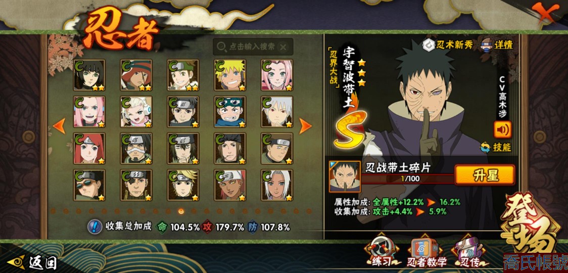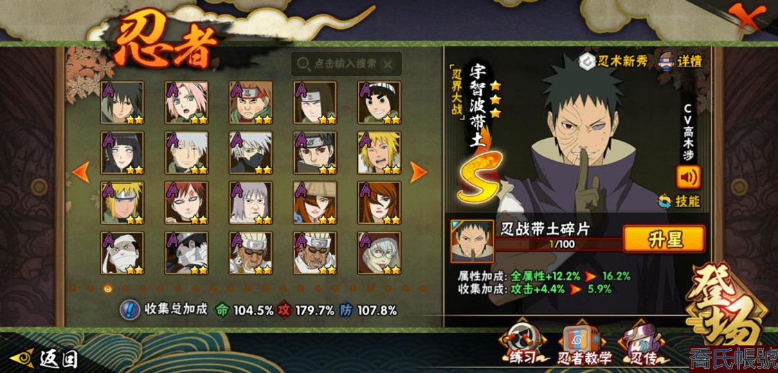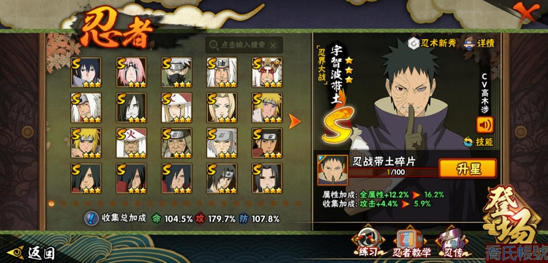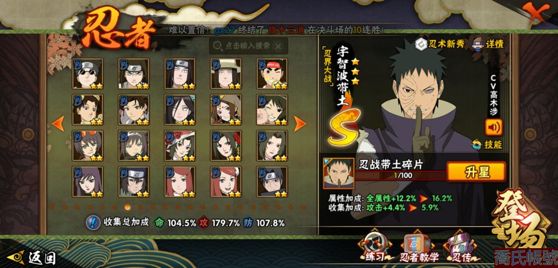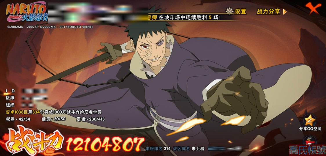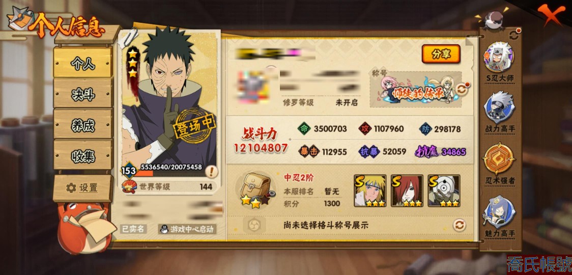 【11等】戰鬥力:1210W+;段位:中忍2階;本服排名:314;戰區排名:未上榜;V